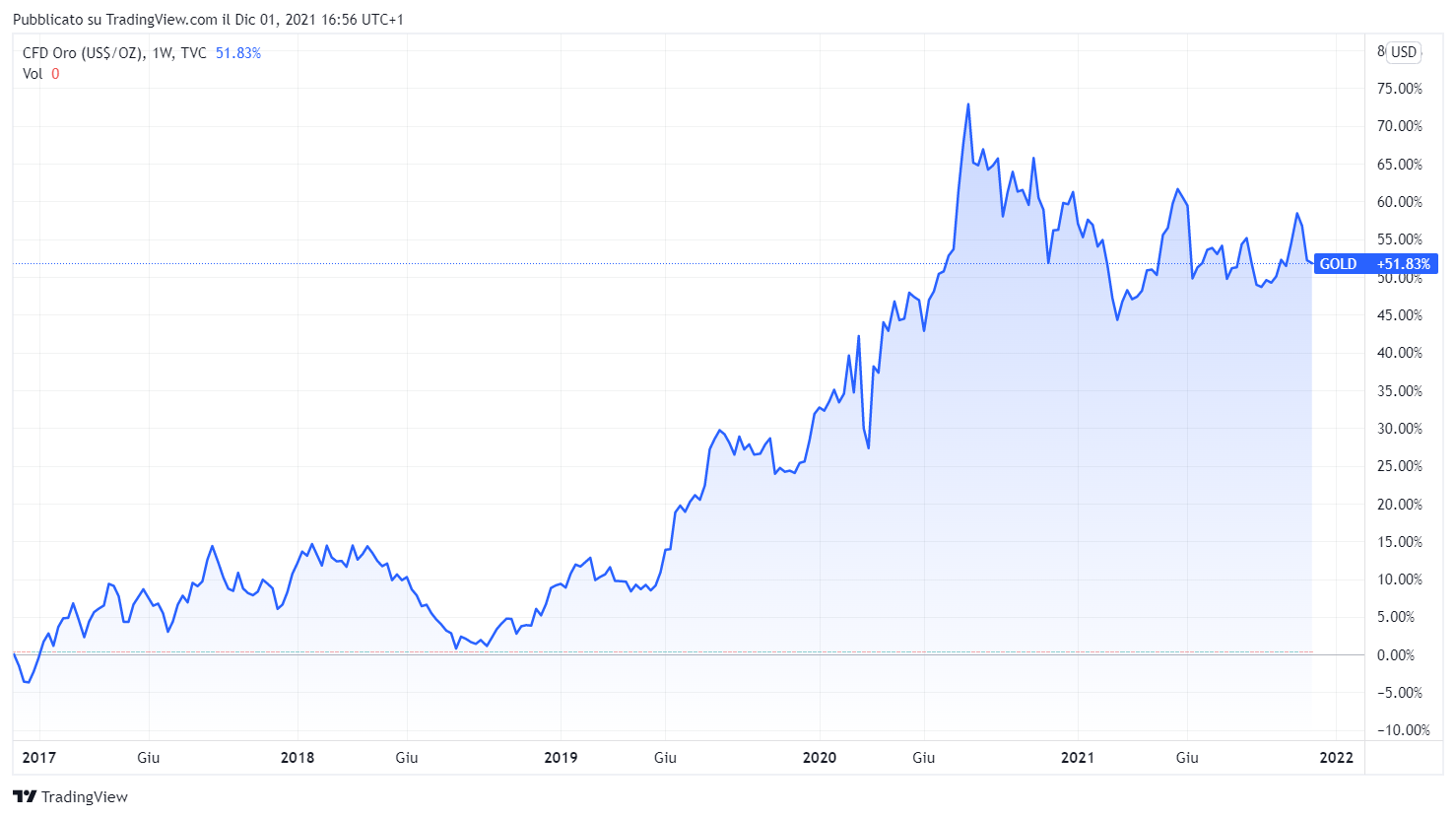 Il 2022 però potrebbe essere l’anno di rilancio dell’oro, se le varianti del Covid dovessero intralciare la produzione e lo scambio di beni e servizi il mercato azionario rallenterebbe.
