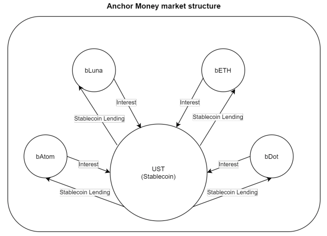- money market: è una pool di stablecoin UST. Questi UST derivano da gente che mette a disposizione il proprio capitale per altri utenti che vogliono prendere un prestito. Nel money market è presente: