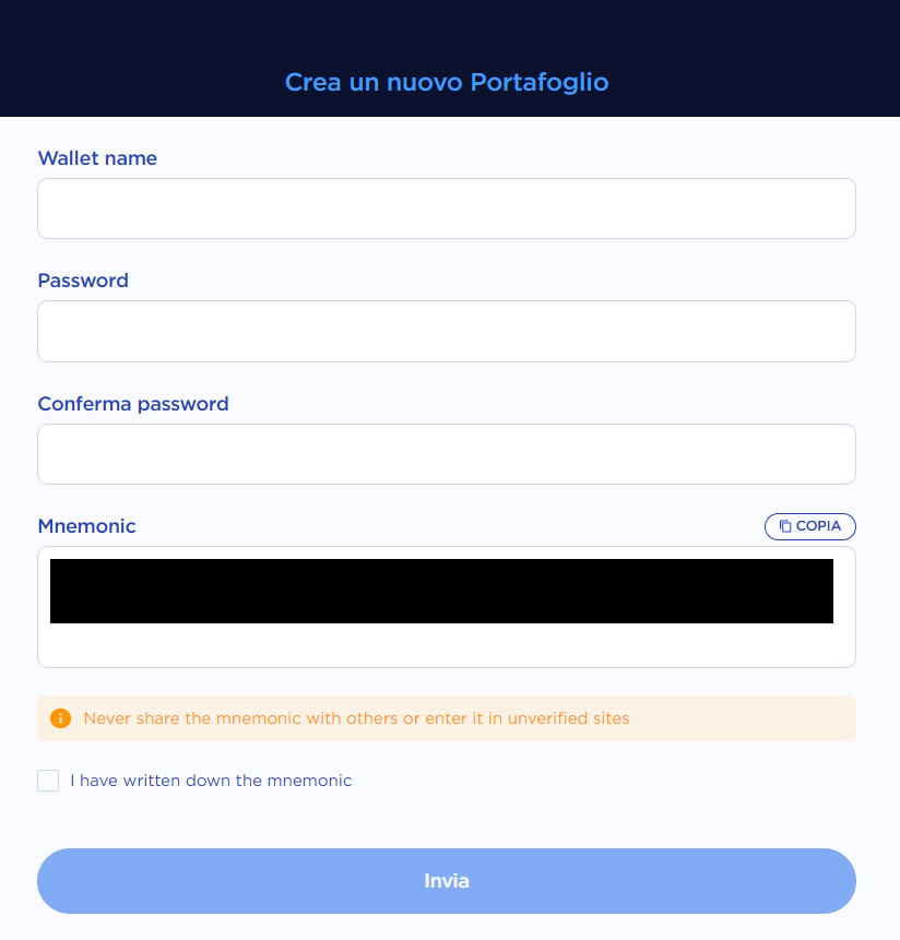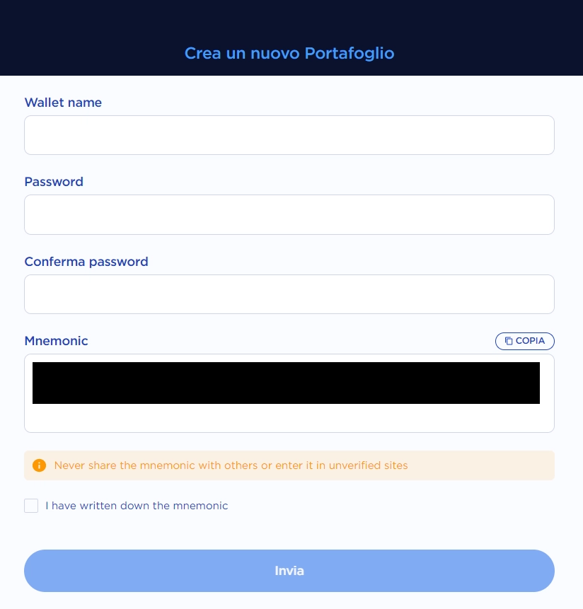 Crea un nuovo wallet