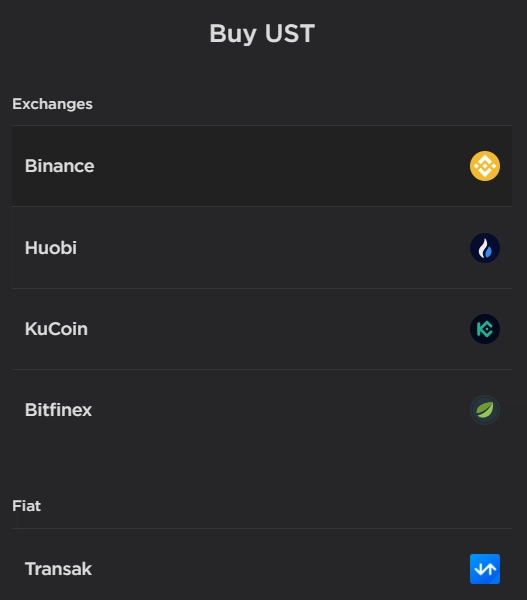 Ti consiglio di comprare UST dall’exchange dove hai già un account e solo come ultima scelta optare per Transak in quanto, anche se l’acquisto tramite carta o bonifico è comodo, dovrai inserire i tuoi dati personali e pagare delle fee elevate per la transazione.