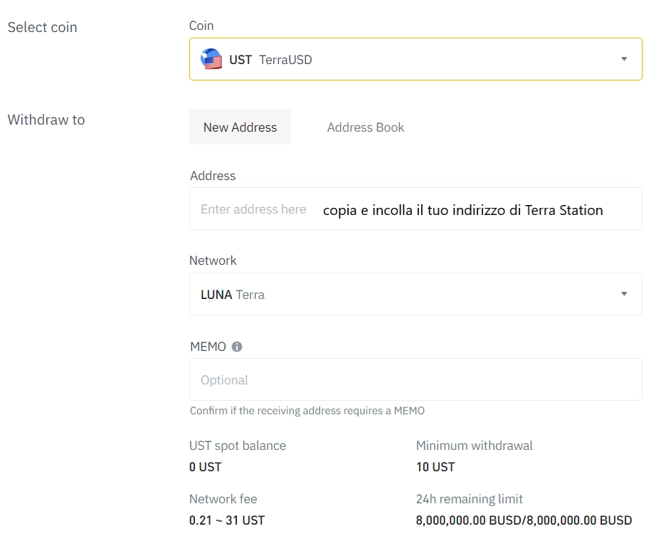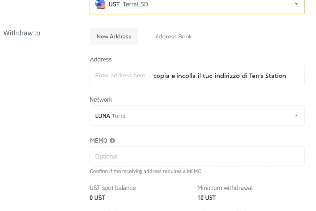 Selezione come crypto UST e inserisci il tuo indirizzo pubblico facendo copia e incolla da Terra Station.