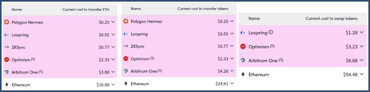Per capire l’estremo vantaggio che ci garantisce Arbitrum ci facciamo aiutare da “L2 Fees” che confronta le commissioni tra i vari Layer 2 ed Ethreum.
