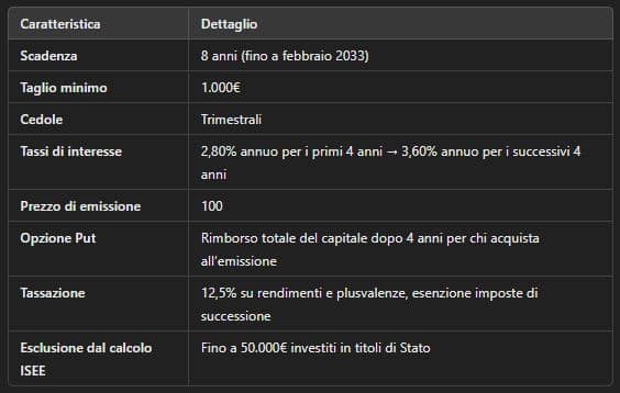 Questo strumento fa parte della famiglia BTP Valore, ma introduce una caratteristica innovativa: la facoltà di rimborso anticipato dopo quattro anni (opzione put).