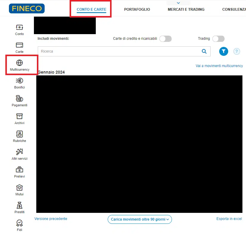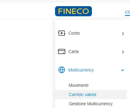 Per comprare dollari su Fineco è necessario andare su “Conto e Carte” e successivamente cliccare su Multicurrency dal menù a tendina a sinistra.