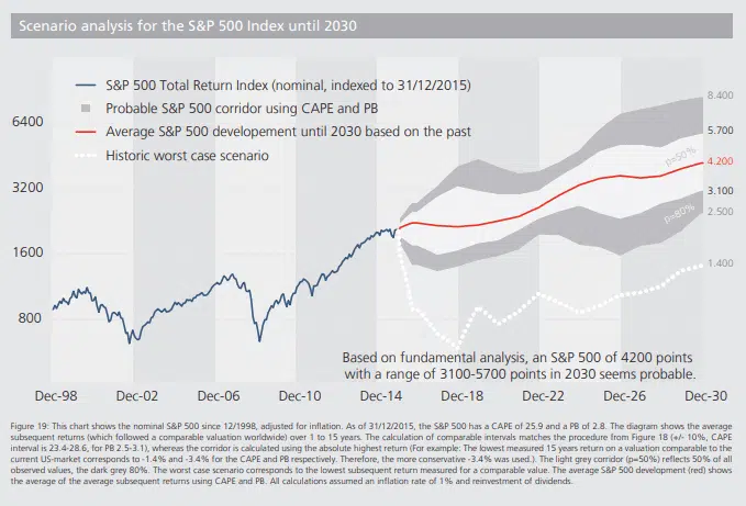 Molto interessante anche questo grafico su S&P dove si prova a dedurre un possibile andamento futuro (fino al 2030). Anche questo grafico è datato 2015.