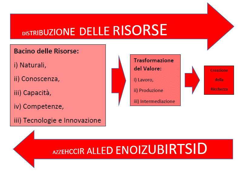 Da ciò si genera l’Attuale e Decadente Meccanismo dell’impoverimento (Meccanismo di perdita del valore ed accentramento della ricchezza), rappresentato nello schema seguente dove le dimensioni dei riquadri e delle lettere sono altrettanto significanti quanto ai contenuti dei contenitori.