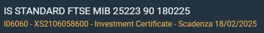 Questo certificato Digital sul FTSE MIB, il principale indice azionario italiano, prevede che se alle date di rilevazione/valutazione il prezzo del sottostante è superiore al prezzo strike di 25.223 verrà pagato il premio/cedola di 26€.