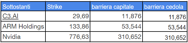 La barriera capitale è del 40%, di tipologia discreta (valida solo a scadenza). Anche la barriera cedole è del 40%.
