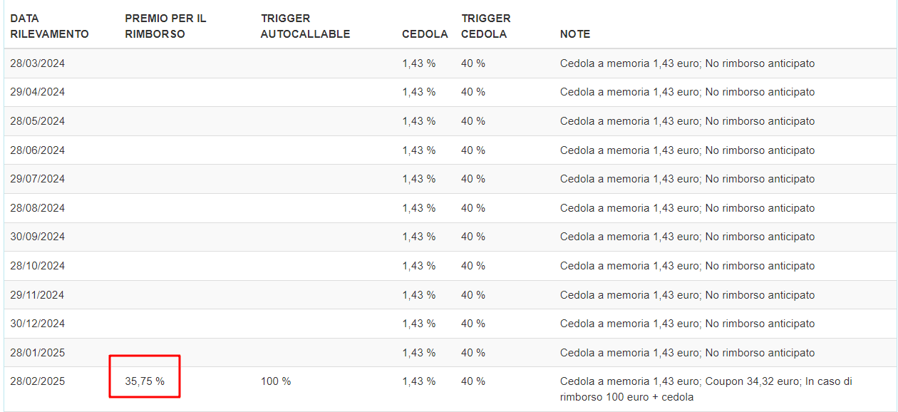 In cosa consiste quindi l’effetto all coupon? Se fin qui questi certificati sono identici ai normali cash collect memory, la differenza la iniziamo a vedere in data di rilevamento 28/02/2025 quando è possibile il rimborso anticipato (infatti nell’immagine vediamo trigger autocallable 100%) e premio per il rimborso del 35.75%.