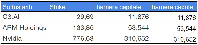 La barriera capitale è del 40%, di tipologia discreta (valida solo a scadenza). Anche la barriera cedole è del 40%.