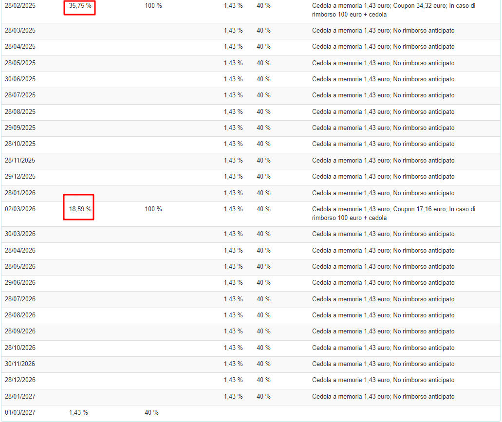 Nell’esempio in questione vi sono solo due date di rilevamento dove il certificato può andare a rimborso anticipato, nella prima data (28/02/2025) l’investitore prenderebbe un premio per il rimborso del 35.75%, nella seconda data (02/03/2026) del 18.59%.