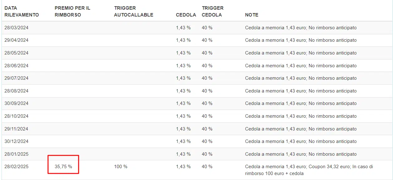 In cosa consiste quindi l’effetto all coupon? Se fin qui questi certificati sono identici ai normali cash collect memory, la differenza la iniziamo a vedere in data di rilevamento 28/02/2025 quando è possibile il rimborso anticipato (infatti nell’immagine vediamo trigger autocallable 100%) e premio per il rimborso del 35.75%.