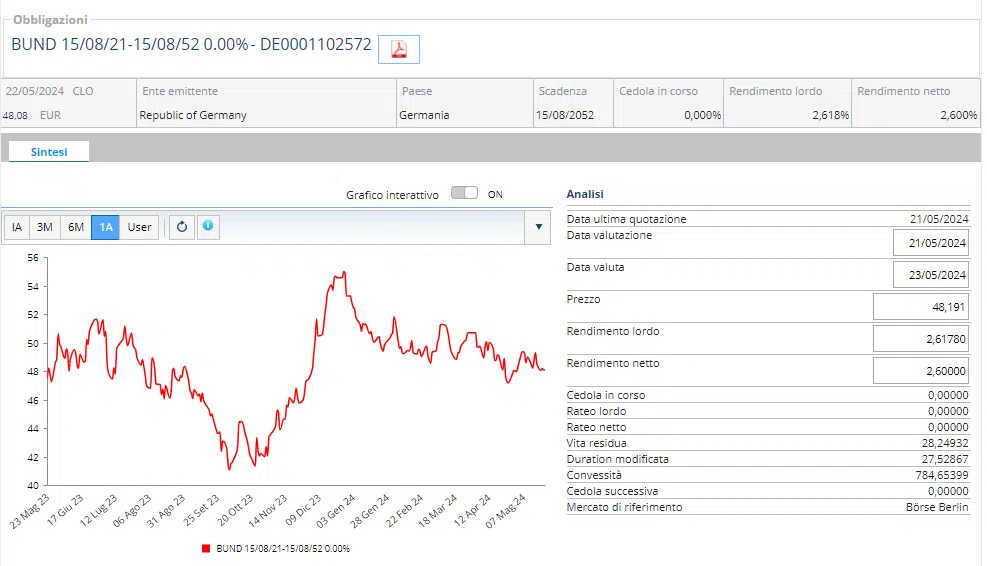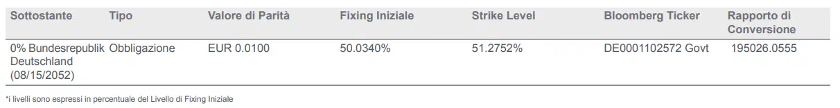 Come sottostante ha un titolo obbligazionario governativo (Germania DE0001102572) con cedola dello 0%, e con scadenza 08/15/2052. L’obbligazione in questione ha una vita residua di 28 anni ed una duration modificata di 27.52.