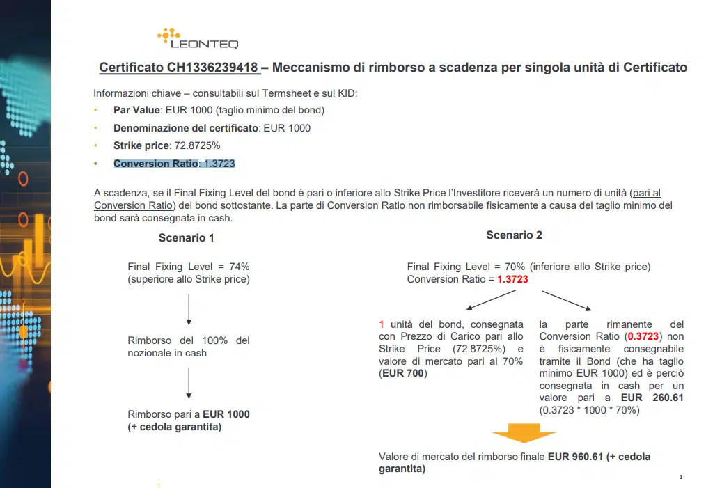 - la parte rimanente del rapporto di conversione (0.950260555) non è fisicamente consegnabile tramite il bond (che ha un determinato taglio minimo), quindi viene consegnata cash all’investitore per un valore pari a (1000 *0.48* 0.950260555) 456.1251€