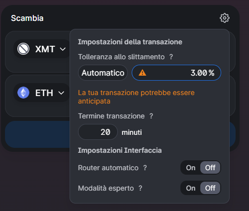 N.B. Ricordati che saranno necessari ETH, non solo per comprare XMT ma anche per pagare le fees di acquisto o di eventuale vendita (o per mettere in staking XMT in futuro)