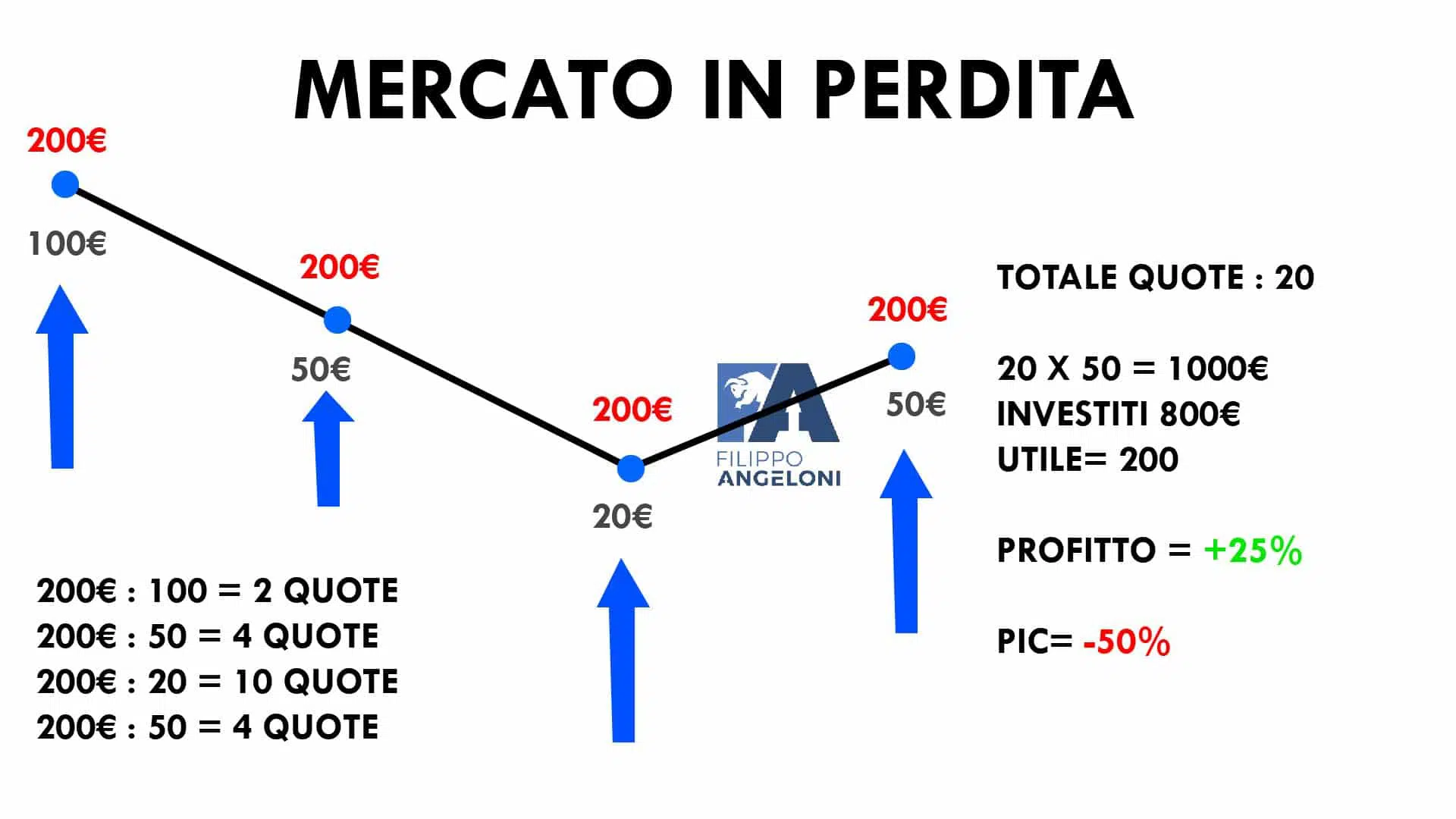 Come puoi notare se fossi entrato con tutto il capitale subito (PIC) saresti in perdita del 50%, mentre entrando con un PAC saresti in profitto del 25% e avresti accumulato un maggior numero di quote.
