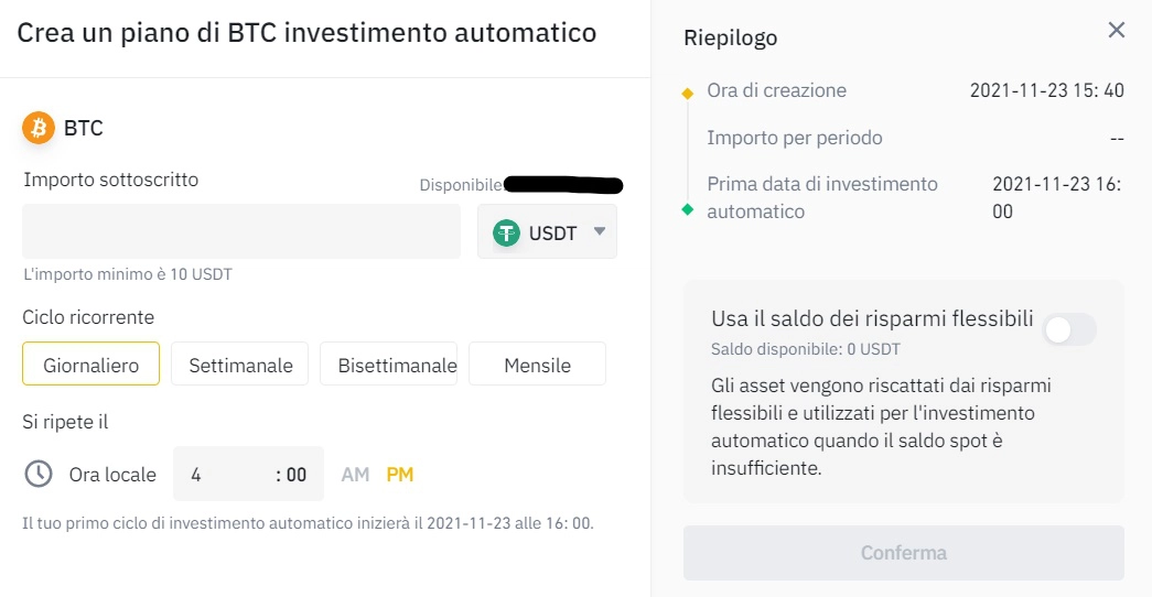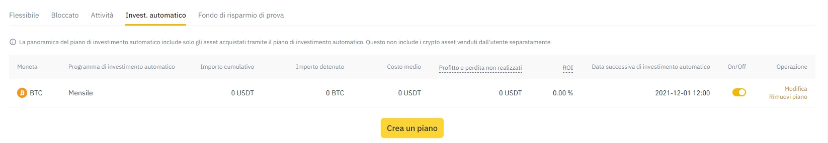 Un piano di accumulo di capitale automatico è un investimento che viene effettuato direttamente dall’exchange, in questo caso Binance, in base alle regole che hai impostato.