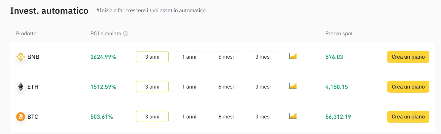 - tutte le criptovalute disponibili cioè BTC, ETH e BNB e creare quindi 3 piano diversi.
