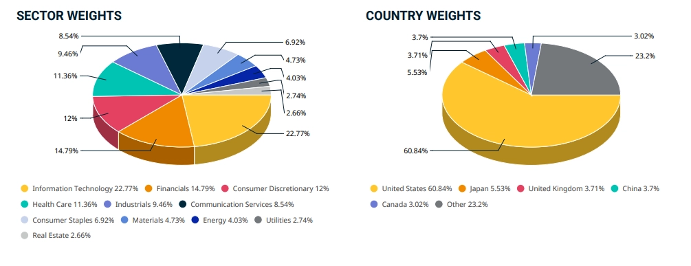 - MSCI All Country World, intero mondo con 23 paesi sviluppati e 25 paesi emergenti;