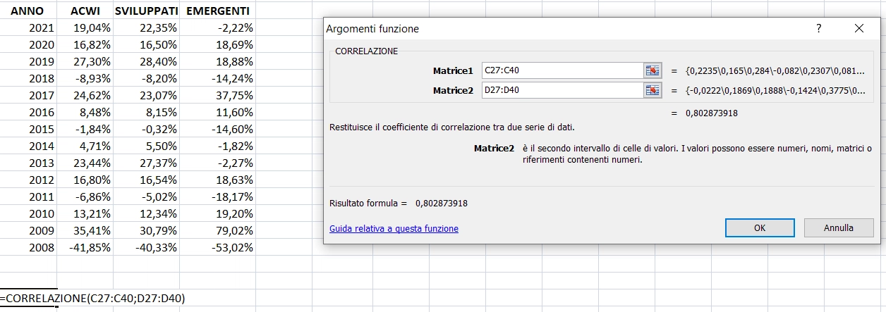 Come puoi notare dalla foto il coefficiente di correlazione tra MSCI World e MSCI EM negli ultimi 14 anni è appunto di 0,80.