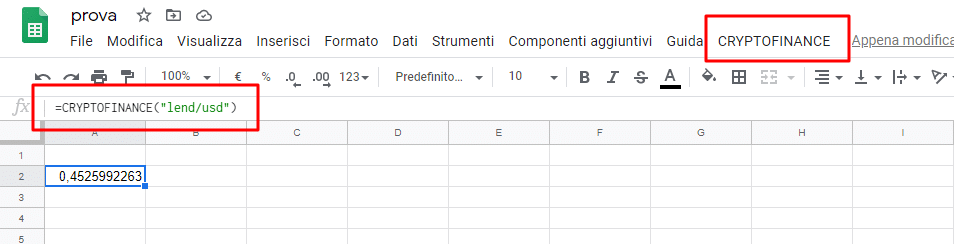 - ricordati di inserire la formula in questo modo =cryptofinance(“lend/usd”)