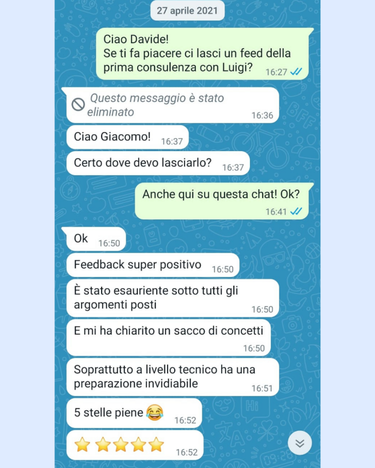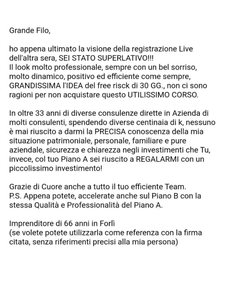 Di tutti i consulenti di cui mi avvalgo in oltre 32 anni, nessuno è stato così semplice e chiaro come Filippo Angeloni. Complimenti per la professionalità, le capacità comunicative e per al qualità dei contenuti. Grazie!