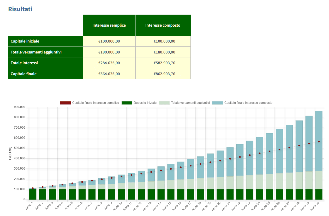 - l’interesse composto, con reinvestimento, è pari a 862.903€