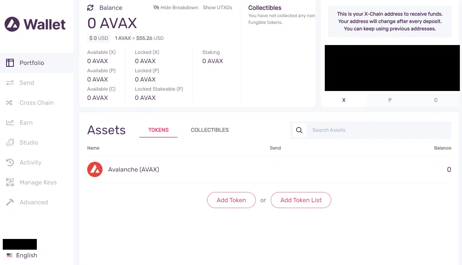 Dopo aver creato il tuo Avalanche Wallet accederai alla schermata principale.