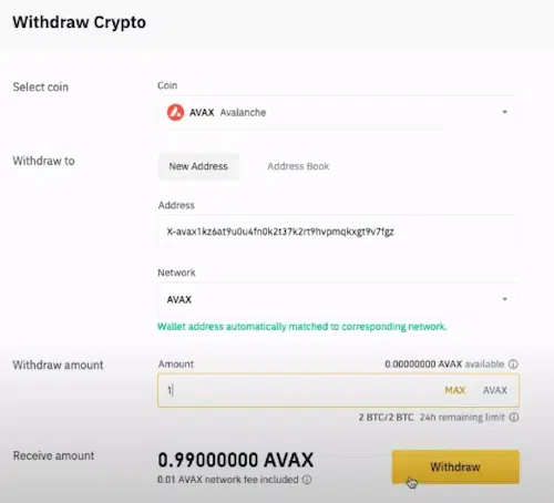 Premi su withdraw per confermare la transazione. Le fee sono fisse e pari a 0,01 AVAX.