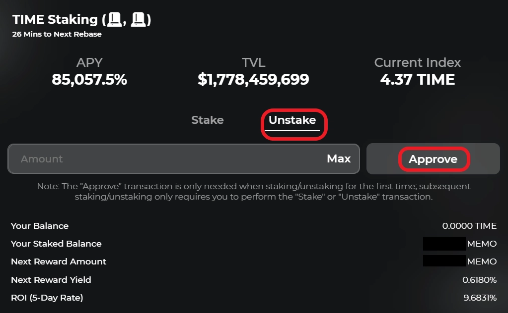 Nell’interfaccia dell’app di Wonderland Money c’è il pulsante “stake” e “unstake”. Vai su “unstake”, seleziona la quantità che desideri prelevare o seleziona “max” e premi su “approve”.