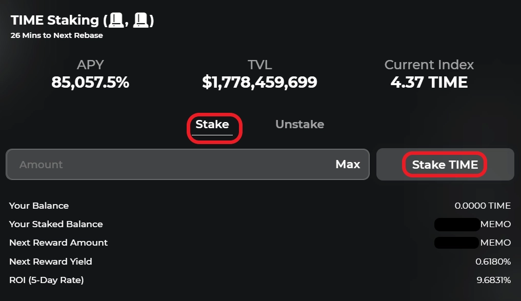 - seleziona la quantità desiderata e premi su “stake TIME”, conferma quindi la transazione pagando delle fees in AVAX.