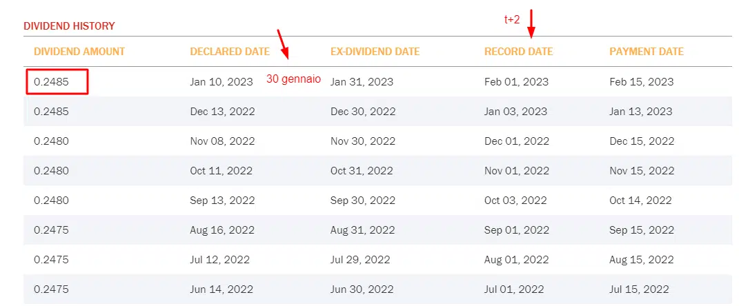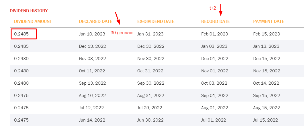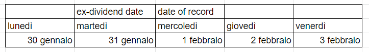 Se compriamo quindi il 31 gennaio (ex-dividend) oppure il 1 febbraio (date of record) non abbiamo quindi diritto al dividendo, dato che il regolamento avviene a T+2., ed il nostro nome non sarà presente nella lista degli azionisti della società alla record date.