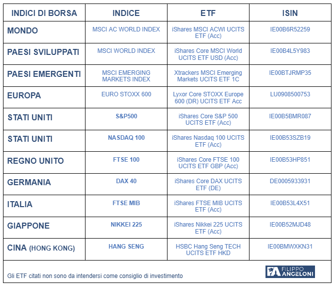 Qui sotto troverai l’elenco dei principali indici di borsa, la loro spiegazione e un ETF con cui poterci investirci.