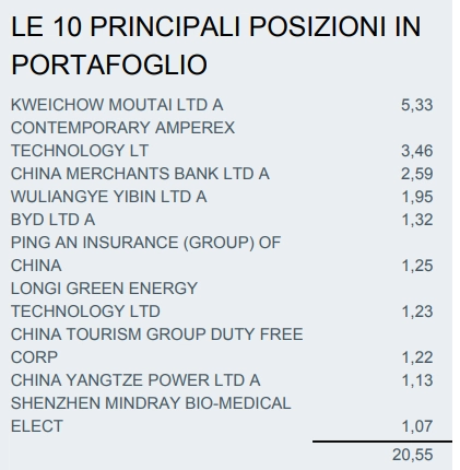 Le prime 10 posizioni in portafoglio detengono il 42,94% con Tencent e Alibaba che hanno una quota superiore al 10%.