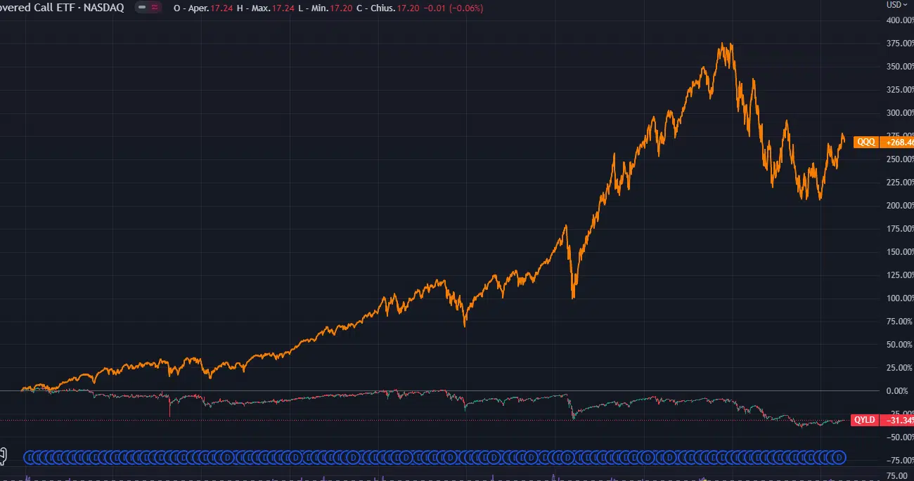 Come puoi notare un ETF sul Nasdaq con questa strategia avrebbe fornito un entrata mensile dell 1% circa, è un’entrata perfetta per chi vuole vivere di rendita, ma allo stesso tempo ci avrebbe fatto rinunciare a guadagni davvero importanti in apprezzamento del sottostante.