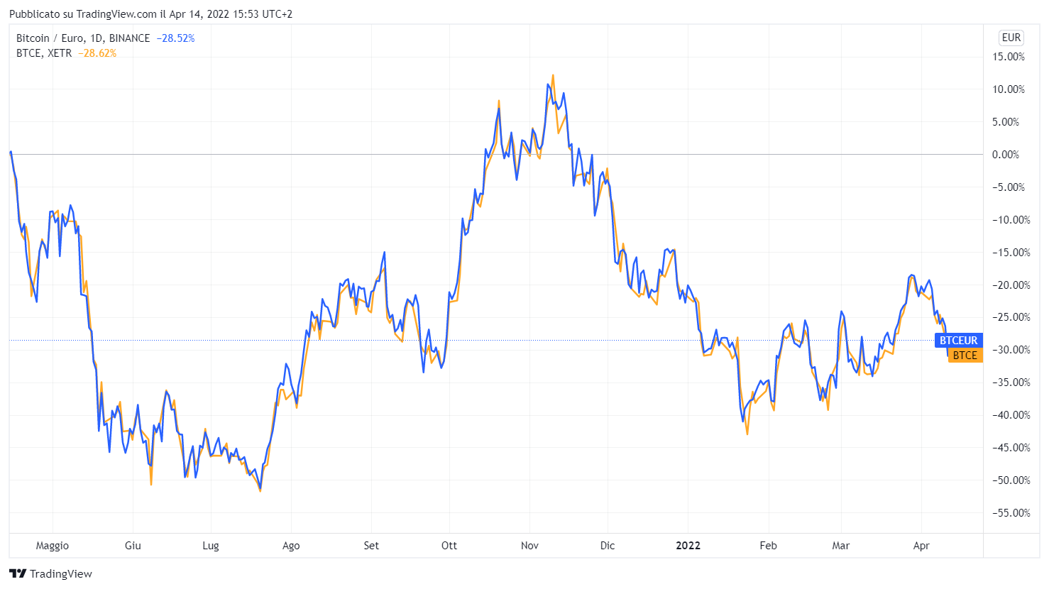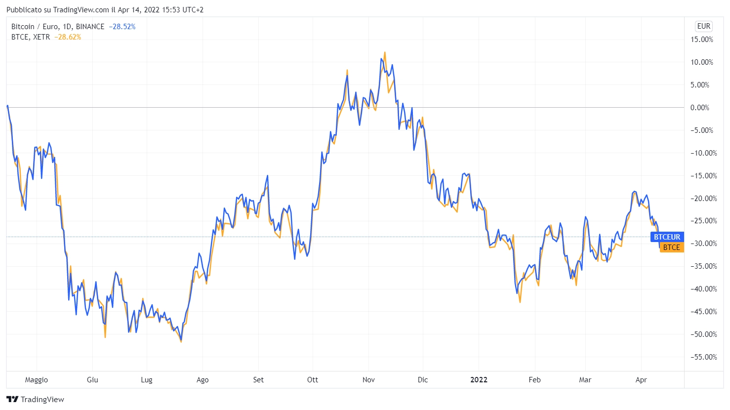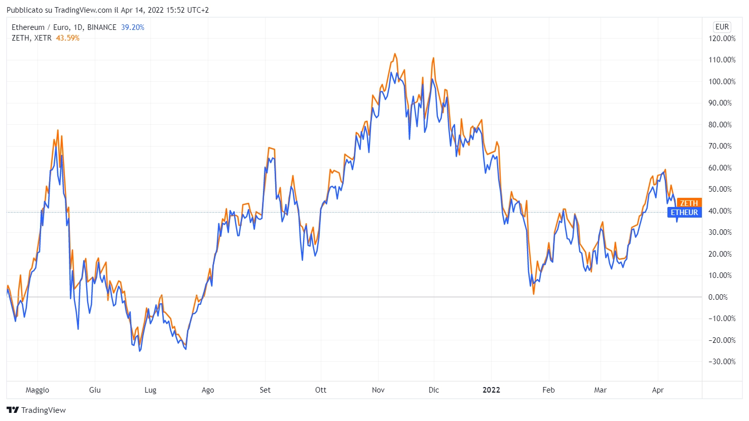 Da questi grafici generati con Tradingview è possibile vedere come la performance di Bitcoin e di Ethereum è stata replicata fedelmente.
