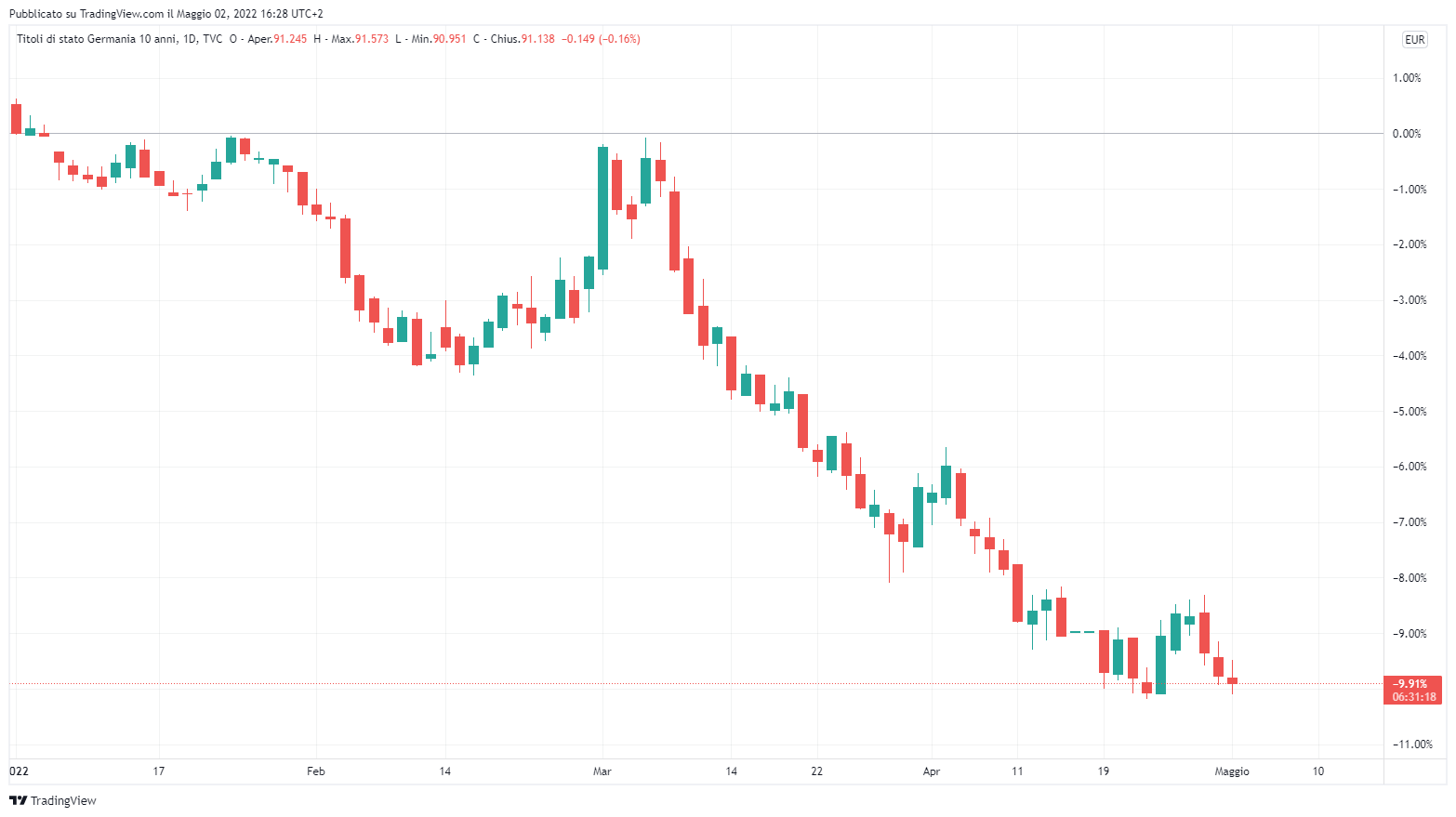 Questo è il grafico del prezzo dei BUND, come vedi ha perso circa il 9%, il rendimento guadagnato dall’ETF short -1x.