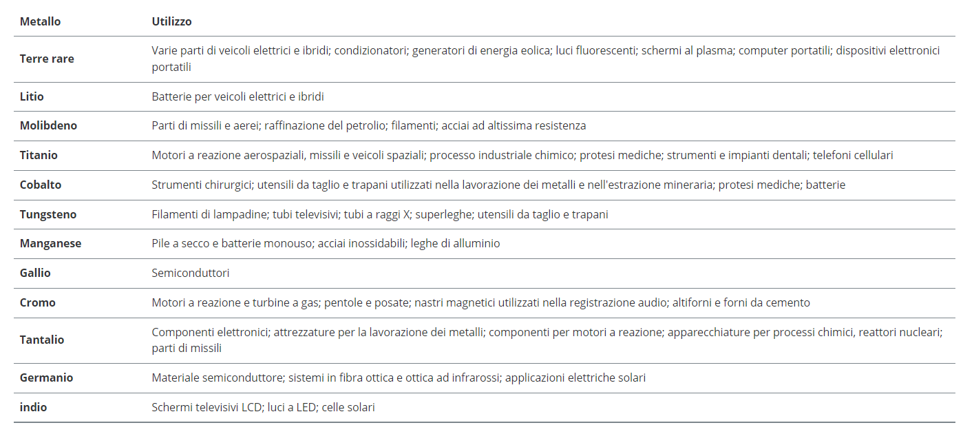 “Nell’elenco dei metalli/minerali minori figurano afnio, antimonio, arsenico, berillio, bismuto, cadmio, cobalto, cromo, gallio, germanio, indio, litio, magnesio, manganese, molibdeno, niobio (o columbio), renio, selenio, stronzio, tallio, tantalio, tellurio, titanio, tungsteno, vanadio, zircone e zirconio.