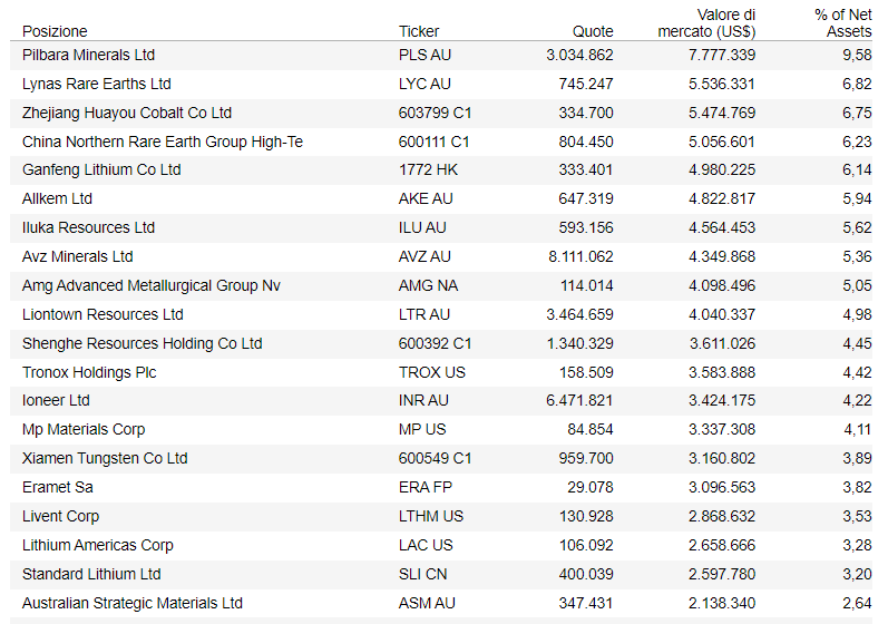 La distribuzione settoriale non è presente in quanto tutte le società investono nei metalli. I materiali più rappresentativi sono il le terre rare e il litio.
