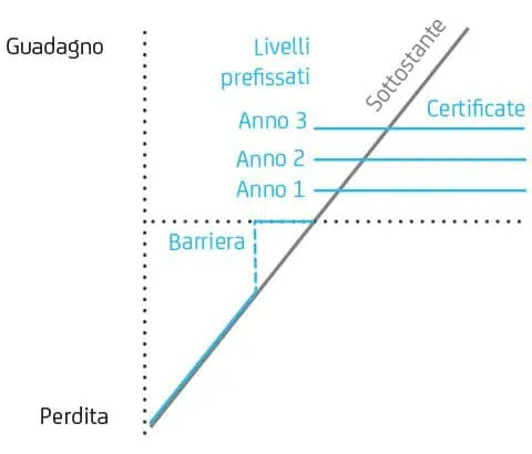 Se ad una data di valutazione il sottostante è sotto il livello bonus (che coincide con autocall) allora li non verrà elargita la cedola, e non si estinguerà in ancitipo il certificato, ma la cedola non verrà persa infatti se in futura data di rilevazione il sottostante è pari o uguale alla soglia bonus verranno date n-cedole ed il certificato si estinguerà in anticipo.
