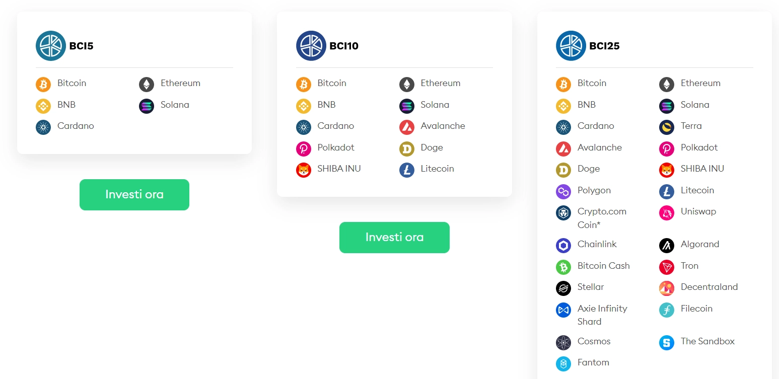 Puoi investire in BTC ed ETH o nella top ten con AVAX, DOT e i meme token oppure in un ampio paniere che comprende altre blockchain come MATIC, TRON e i token del metaverso come MANA e AXS.