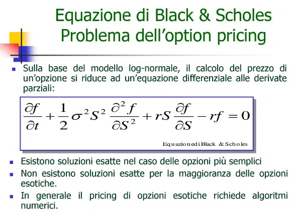 Da questa formula tramite derivate parziali si ottengono tutti i fattori che influenzano il prezzo dell’opzione, e si ottengono in sostanza tutte le greche che vedremo successivamente.