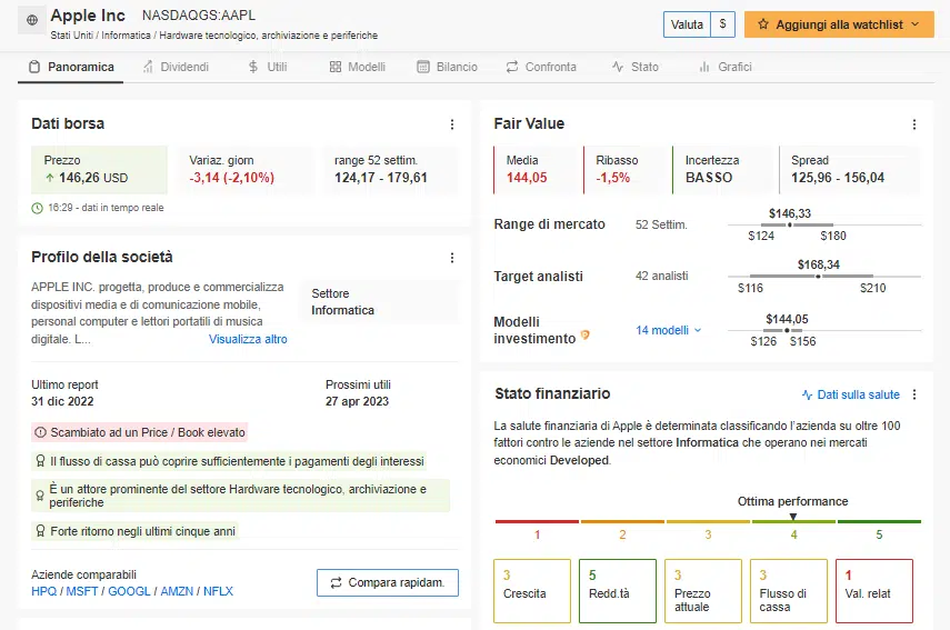 Quando si sceglie un’azione, nel nostro esempio Apple, si passa a questa schermata.