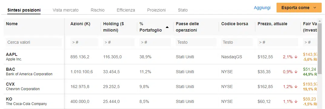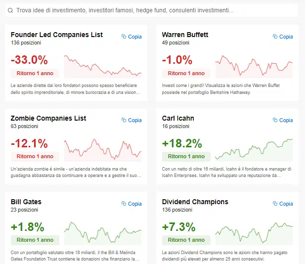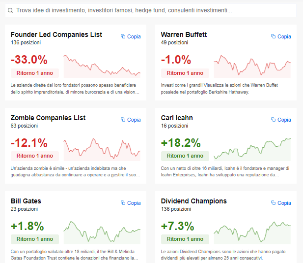 Per esempio troverai il portafoglio di Warren Buffett e di Ray Dalio oppure quello di Ark Invest.