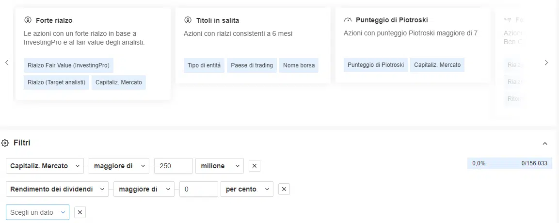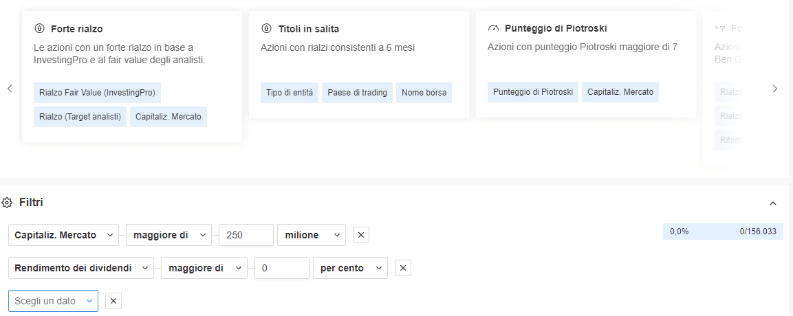 Il filtro è il fulcro della piattaforma perché consente di creare e salvare i tuoi stock screener personalizzati.
