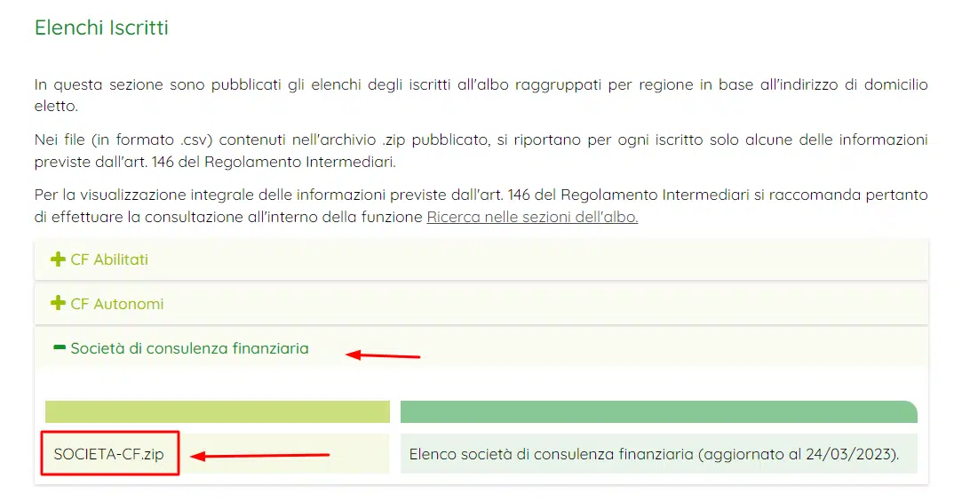 Puoi trovare tutto l’elenco delle società di consulenza finanziaria direttamente dal website dell’OCF (L’Organismo di vigilanza e tenuta dell’albo unico dei Consulenti Finanziari) a questo link, scaricando il file zip dell’elenco completo.