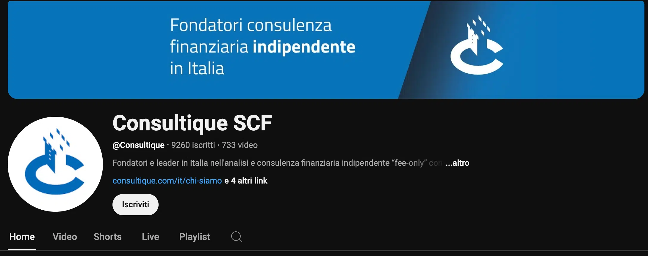 Consultique si definisce così “…Nasce così una nuova professione, quella del consulente finanziario indipendente, che non essendo legato a nessuna banca o rete lavora nell’unico interesse dei propri clienti…Con oltre 20 anni di esperienza, forniamo consulenza finanziaria indipendente a clienti privati, aziende e istituzioni e assistiamo in via continuativa la maggior parte degli studi professionali e società di consulenza finanziaria indipendente operativi sul territorio italiano.”