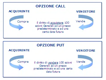 L’opzione è un contratto in base al quale l’aquirente (buyer), detto anche proponente (holder), acquisisce dal venditore (seller), detto anche sottoscrittore (writer), dietro corresponsione di un premio (valore o prezzo dell’opzione), il diritto di vendere (opzione put) o acquistare (azione call) a un prezzo prefissato, il prezzo di esercizio (strike price o exerecise price), detto anche prezzo base, un certo bene, detto attività sottostante (o più semplicemente sottostante), che può essere costituito sia da attività finanziarie sia da beni reali.