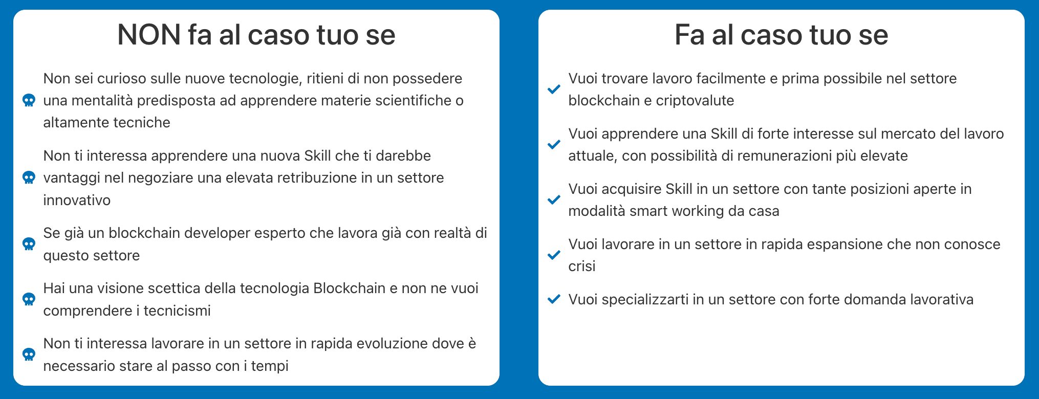 Il Master “Blockchain Developer” è rivolto a tutti coloro che desiderano apprendere una Skill altamente rivendibile nel mercato e trovare lavoro velocemente nel settore Blockchain.