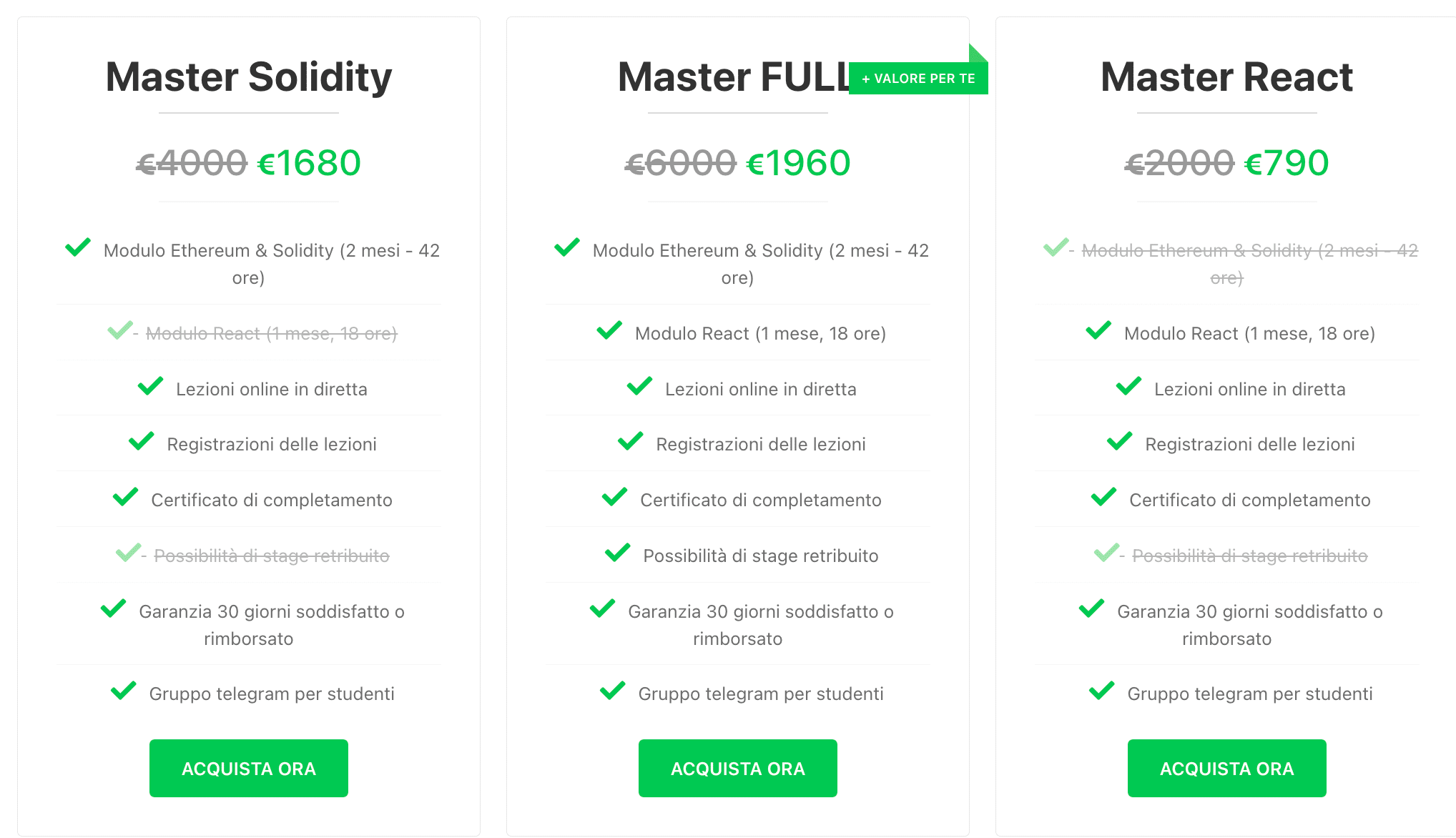 - Master Full; a nostro avviso è il modulo da scegliere se realmente interessati, in quanto presenta anche la parte dedicata a react e al web3, oltre che la possibilità di stage.